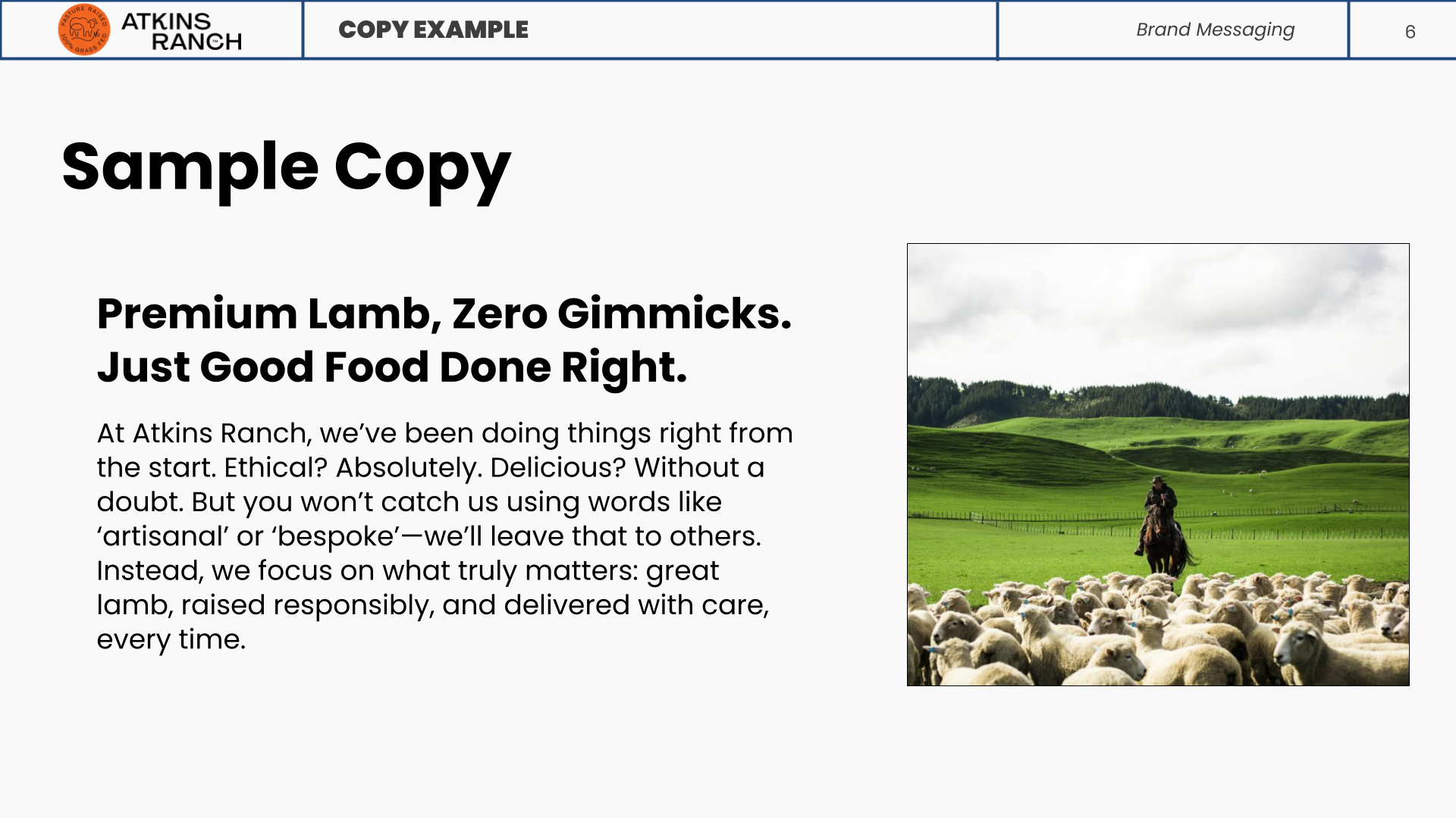 Atkins Ranch and their New Zealand-raised lamb are fan favorites at small food markets. With plans to roll out a bigger consumer-facing presence in the near future, they needed to land who they are as a brand first. After a series of exercises workshops, the true voice of Atkins Ranch is ready to be heard.